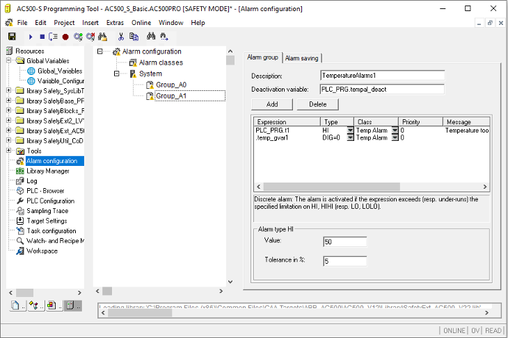 HI Analog alarm, active as soon as the expression exceeds the Value defined for Alarm type HIHI. You can define a tolerance (Deadband). As long as the expression value is within the dead band, no alarm will be activated, even if the HI value has exceeded the limit.