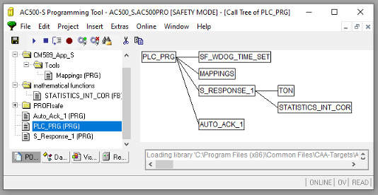 With this command you open a window which shows the call tree of the object chosen in the 'Object Organizer'. Before this the project must have been compiled without any error. The call tree contains both calls for POUs and references to data types.